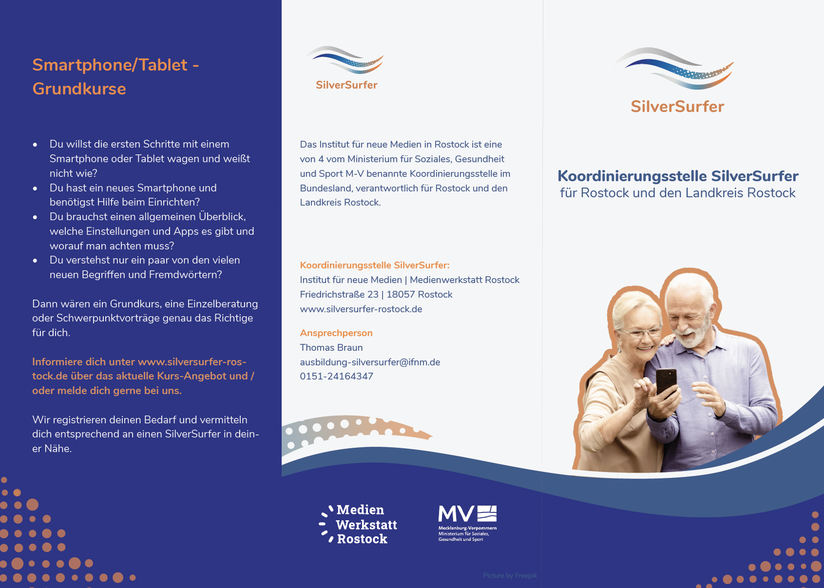 Visual identity and printed materials for the SilverSurfer project supporting digital literacy for seniors. The design focuses on clarity, accessibility, and friendly visual communication.