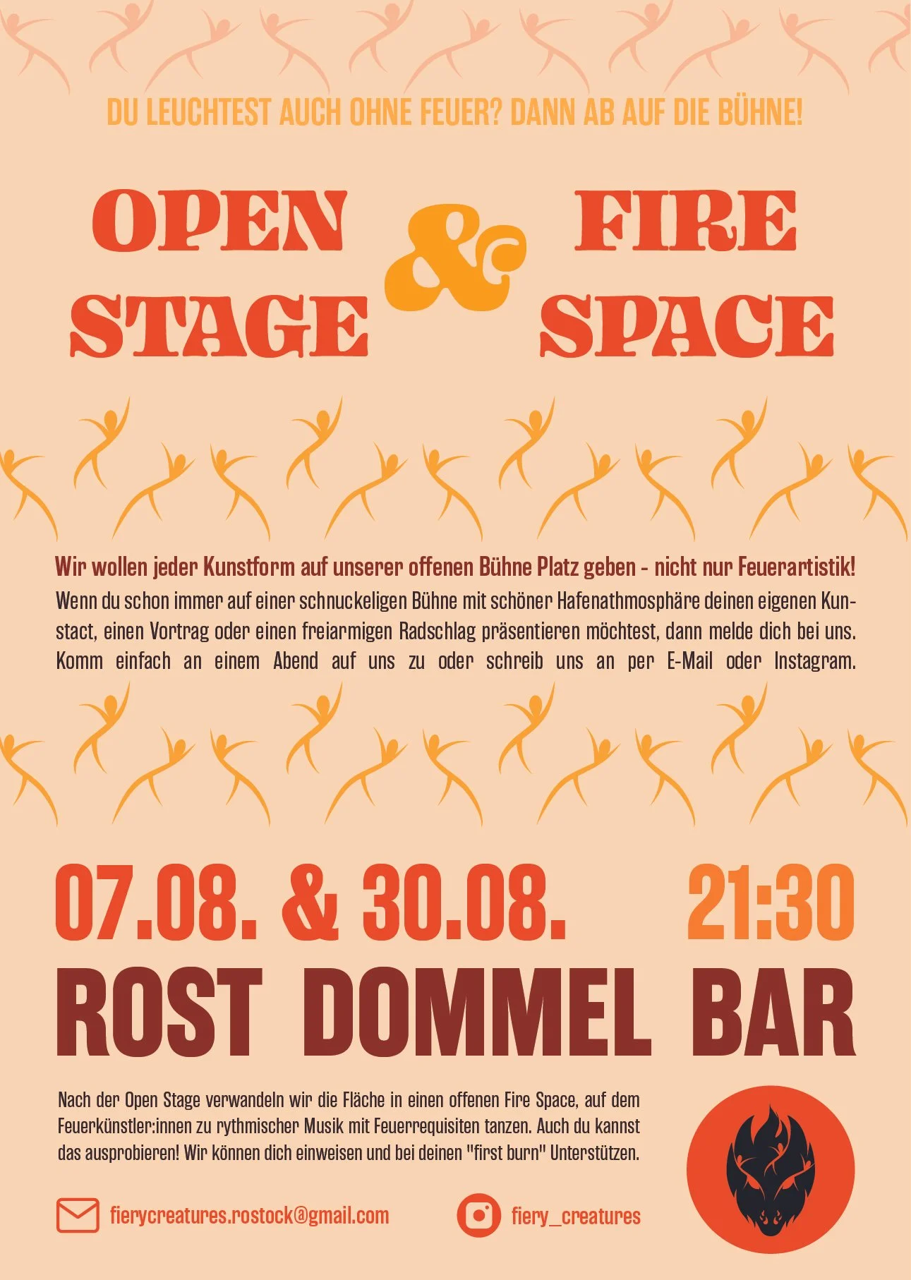 Logo and visual identity for the Fiery Creatures open fire performance community in Rostock. The design combines organic flame-inspired forms with bold graphic elements for posters and event communication.