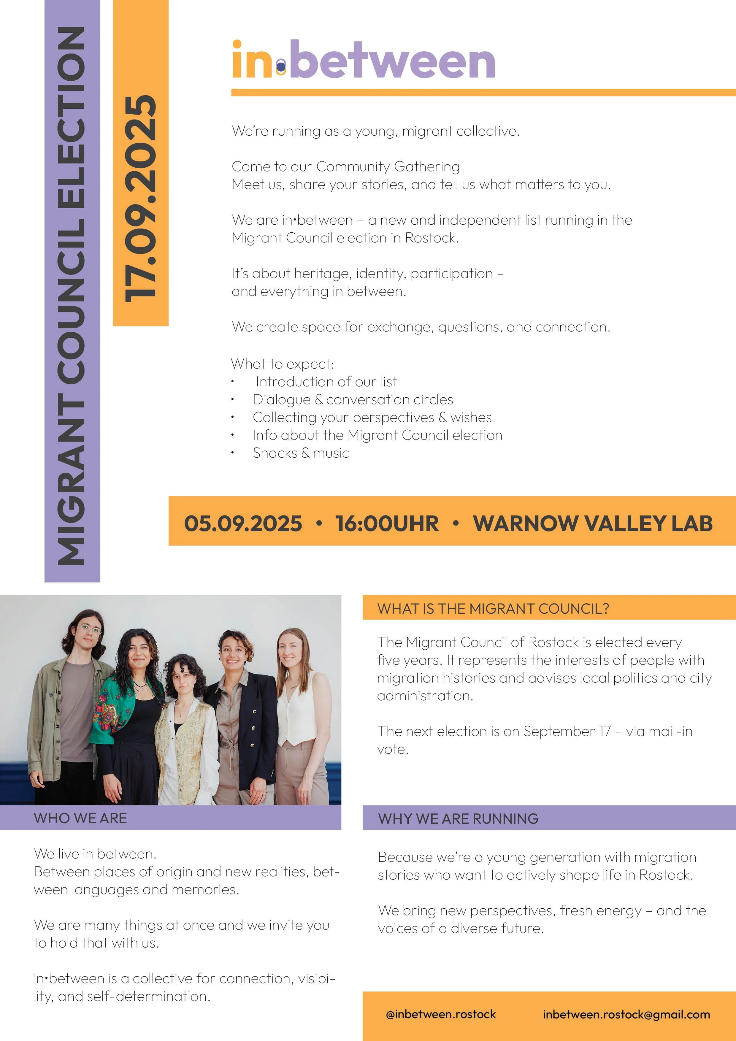 Visual identity and poster design for the “in.between” collective connected to the Migrant Council election in Rostock. The design uses overlapping shapes and contrasting colors to reflect themes of identity, dialogue, and being between cultures.
