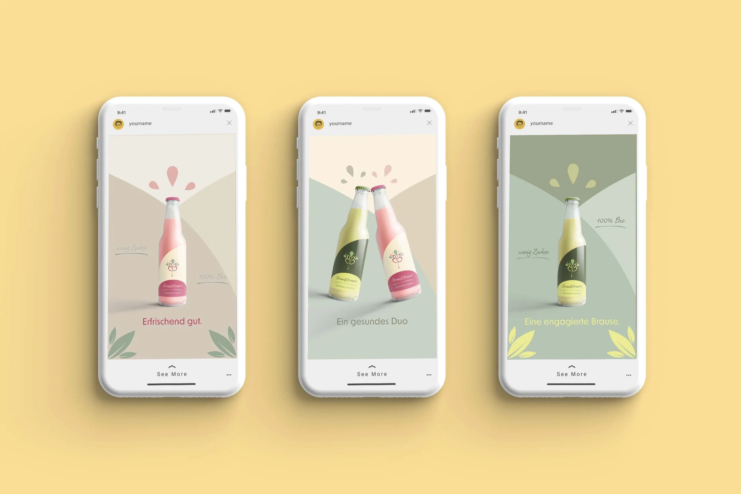 Brand identity and packaging concept for a lemonade brand focused on freshness, natural ingredients, and minimal design. The visual language combines organic shapes, soft colors, and a stylized plant-inspired logo.